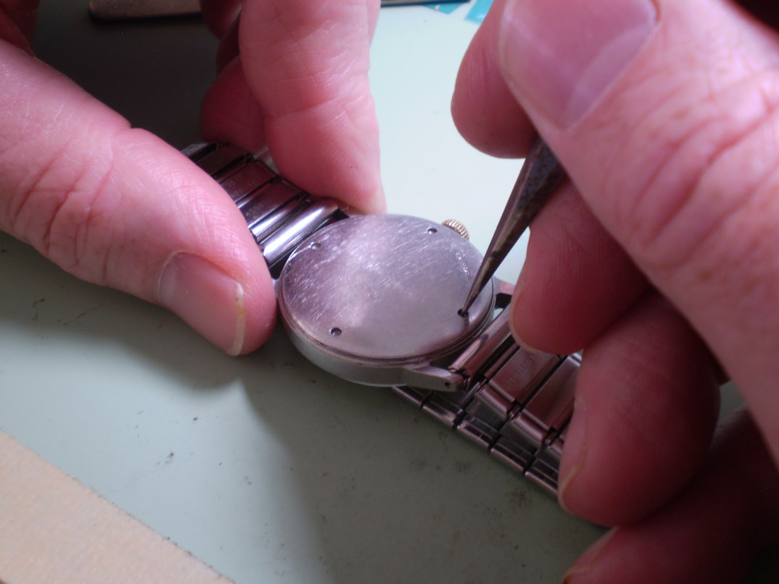 Now you can replace the back, making sure the threads engage properly before using much force to tighten it down. Ideally, you'd have a gasket in this watch, but I don't have any. Also ideally you'd use the proper wrench to tighten the caseback, but I don't have one of those, either!